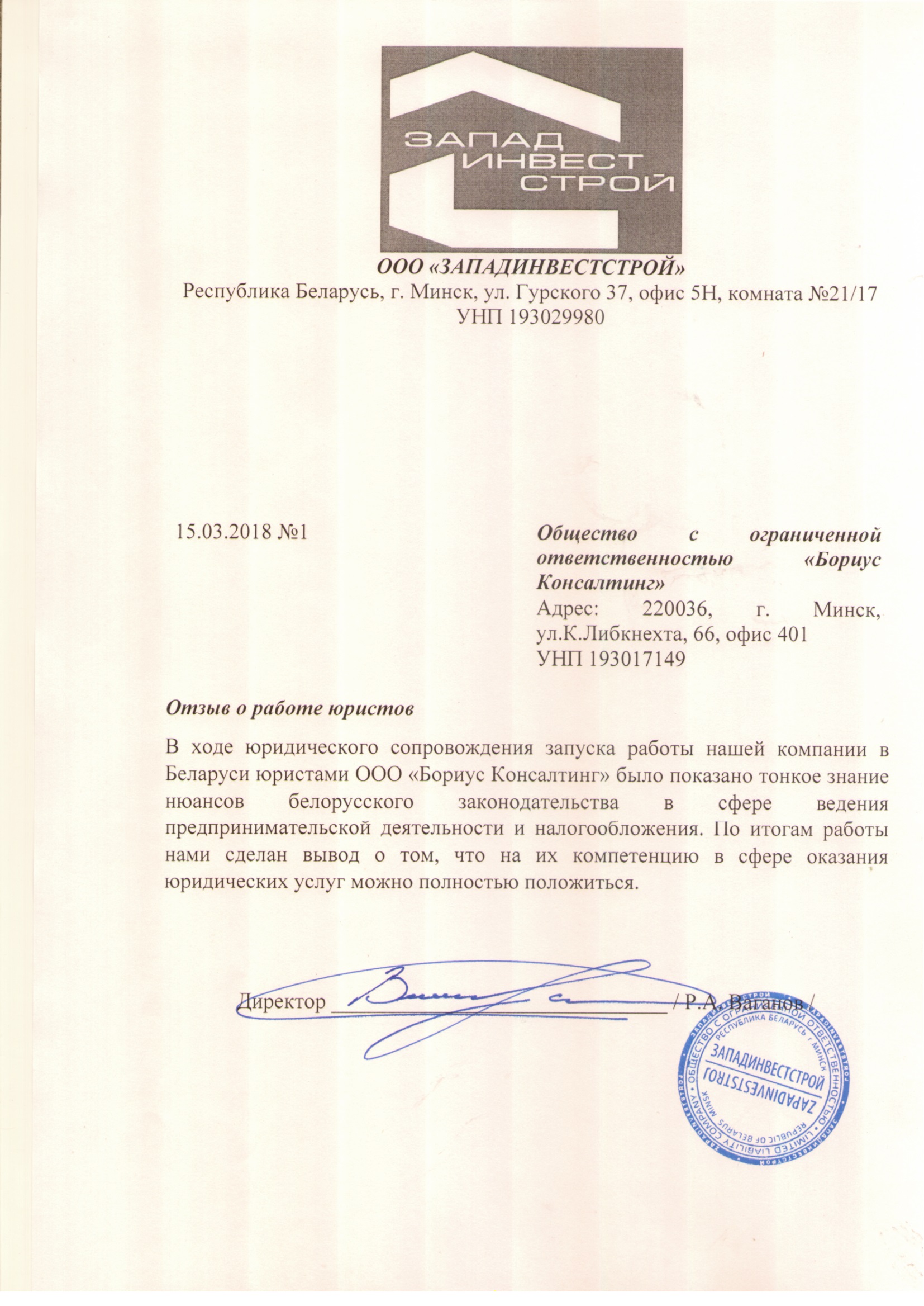 LLC "Zapadinveststroy" about our work on registration of a legal entity in the field of construction (it is a subsidiary of a large foreign company).