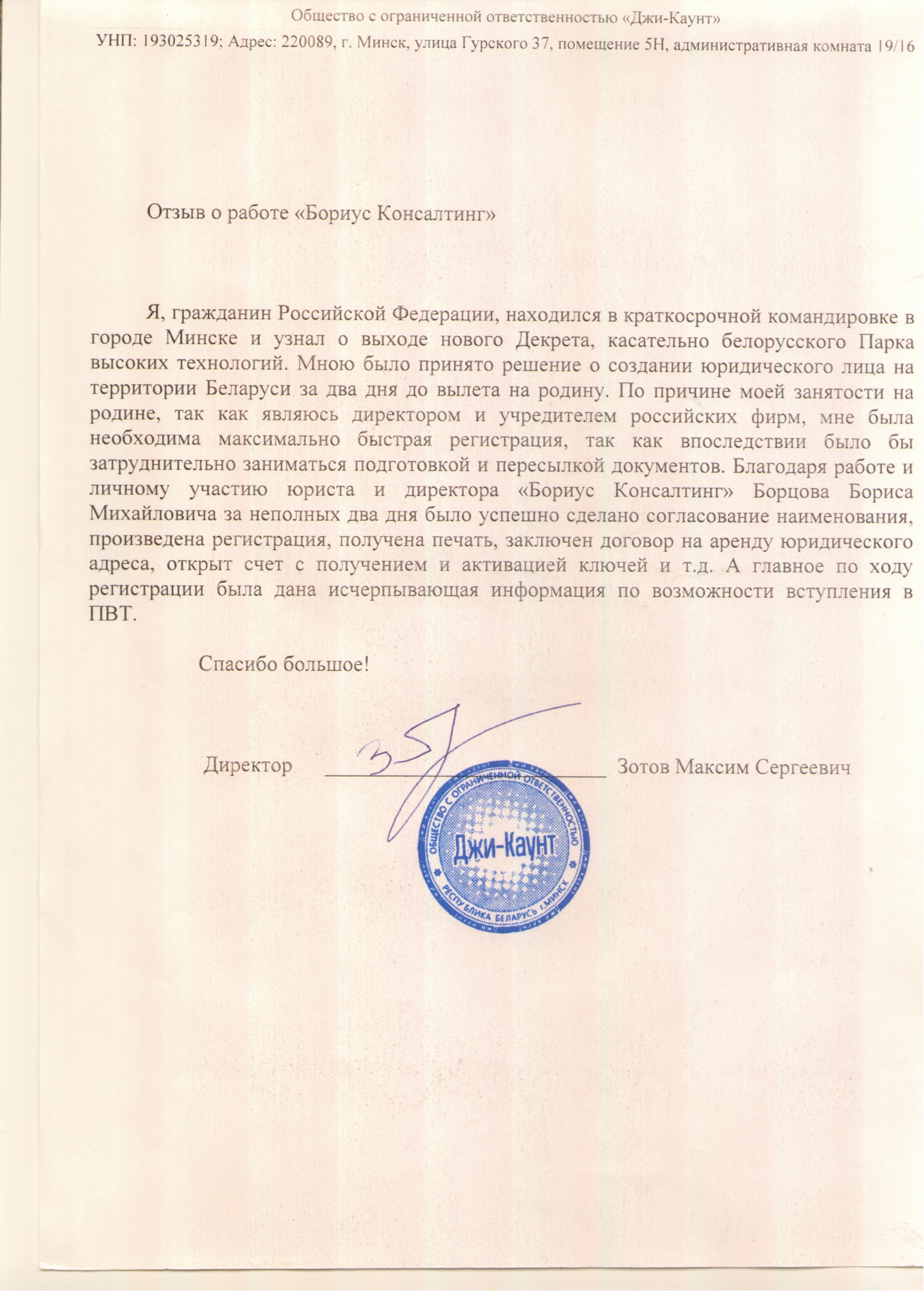We have the largest projects with the participation of both Belarusian and foreign companies with a worldwide reputation. We have been involved in legal support for the incorporation of more than 10 IT companies and trade and industrial enterprises in the Belarusian jurisdiction. We also have experience of interaction regarding the acquisition by a foreign investor of the status of a resident of a free economic zone, a customs guarantor and a representative.